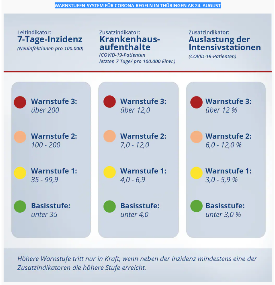 Mit dem 24. August tritt in Thüringen eine neue Verordnung in Kraft, da Verordnungen der Länder nur maximal 28 Tage gültig sein dürfen. Laut Gesundheitsministerin Heike Werner (Die Linke) setzt die neue Verordnung den begonnenen Strategiewechsel fort. Die Landesregierung setze weiterhin auf präventive Schutzmaßnahmen wie Tests, Maskenpflicht und Infektionsschutzkonzepte. Teil dessen ist die Einführung eines neuen Frühwarnsystems. Bei steigenden Infektionszahlen wird künftig nicht mehr nur die Sieben-Tage-Inzidenz als Faktor berücksichtigt. Sie bleibt Leitindikator, hinzu kommen aber zwei neue Zusatzindikatoren: der Schutzwert (lokale Zahl der Krankenhausaufnahmen wegen Corona) und der Belastungswert (landesweite Auslastung der Intensivstationen).