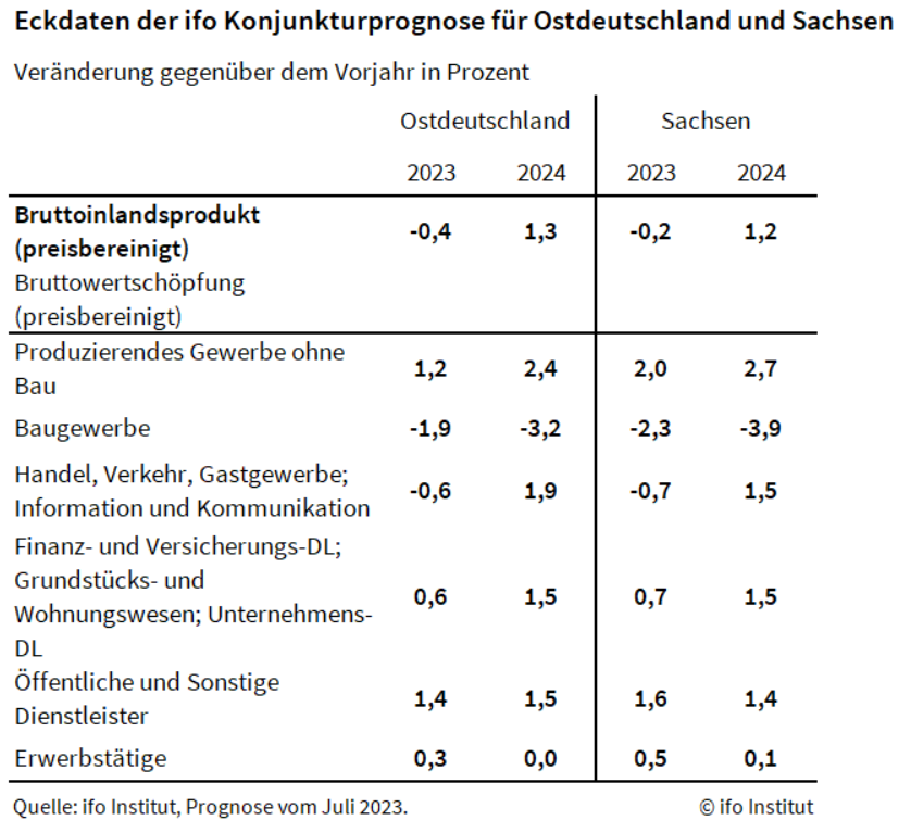 Im Jahr 2023 dürfte die Wirtschaftsleistung in Ostdeutschland um 0,4% schrumpfen; in Sachsen dürfte das Bruttoinlandsprodukt nur um 0,2% zurückgehen (Deutschland: -0,4%). Im kommenden Jahr dürfte die wirtschaftliche Leistung in Ostdeutschland und Sachsen dann wieder um 1,3% bzw. 1,2% zunehmen (Deutschland: 1,5%).